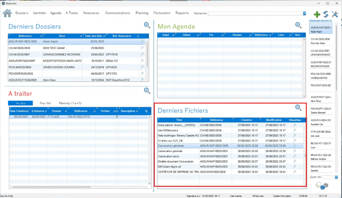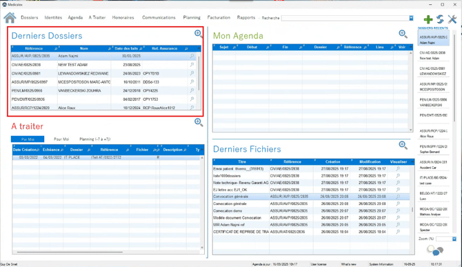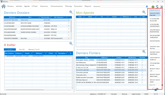 Les dossiers récemment ouverts ou modifiés sont listés dans cette partie qui est également accessible depuis n'importe quelle page de Medicalex.