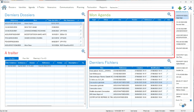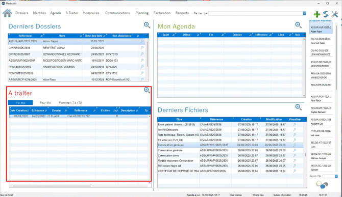 L’onglet Accueil de Medicalex centralise les informations clés nécessaires à votre organisation quotidienne. En regroupant dossiers, tâches, agenda et fichiers dans une seule vue, il vous aide à travailler de manière plus fluide, plus rapide et plus structurée dès votre connexion.