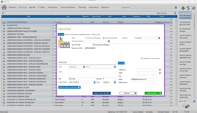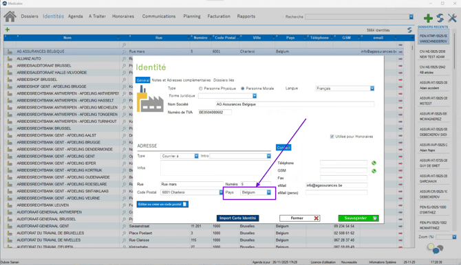 Vous pouvez modifier le pays d’une partie prenante directement depuis l’onglet Identités dans Medicalex. En quelques clics, vous mettez à jour l’information et assurez la cohérence des données dans votre dossier.