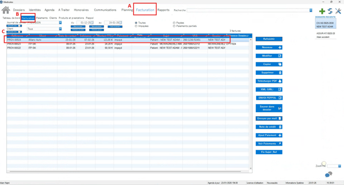- Étape 1: Cliquez sur le module Facturation (A), puis sur le sous-onglet Facturation (B) et double-cliquez sur la facture (C) pour l'ouvrir.