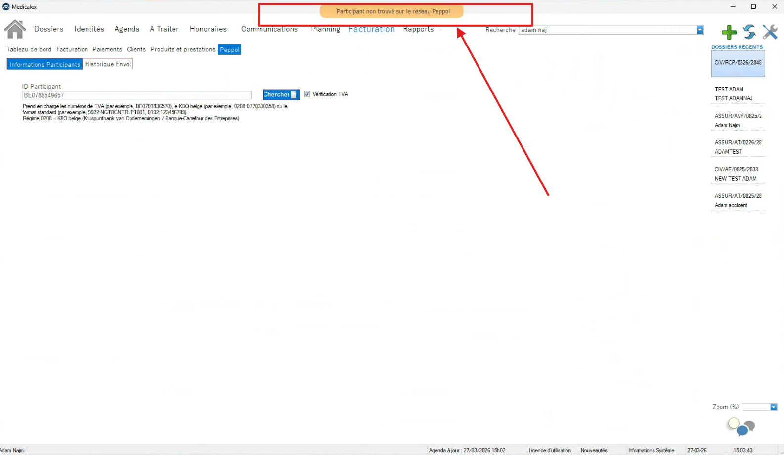 Si le numéro de TVA n’est pas valide ou n’est pas trouvé dans VIES, Medicalex vous l’indique clairement. Dans ce cas, l’envoi Peppol risque d’être rejeté et il est recommandé de vérifier le numéro auprès du destinataire avant de continuer.