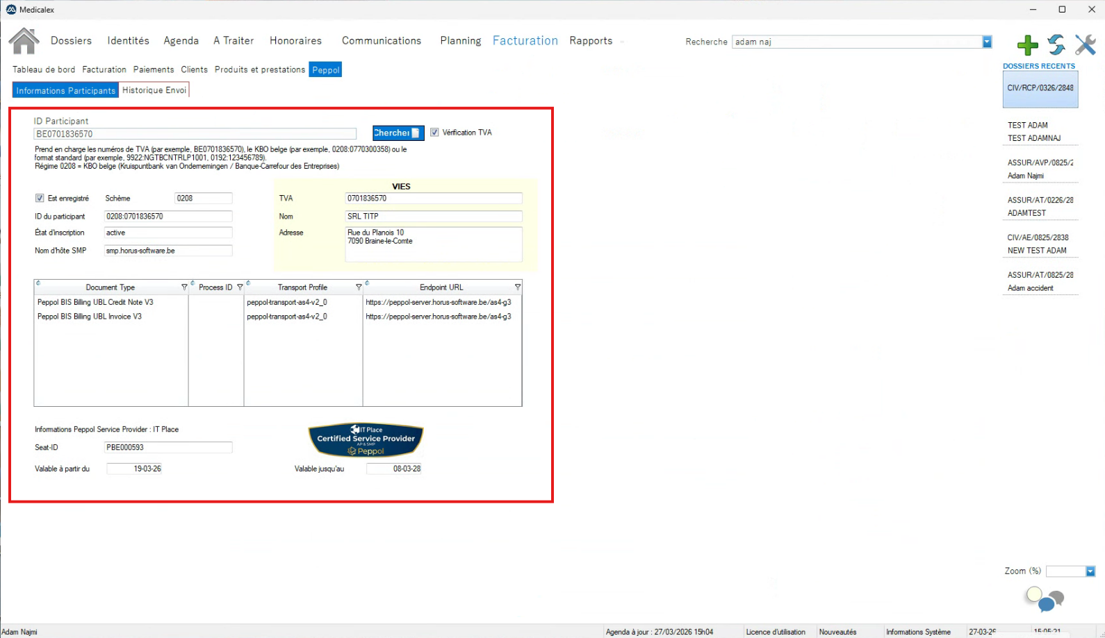 Si le numéro de TVA est valide, Medicalex confirme qu’il est reconnu au niveau européen. Cela signifie que le destinataire est correctement identifié et que la facture peut être envoyée via Peppol.