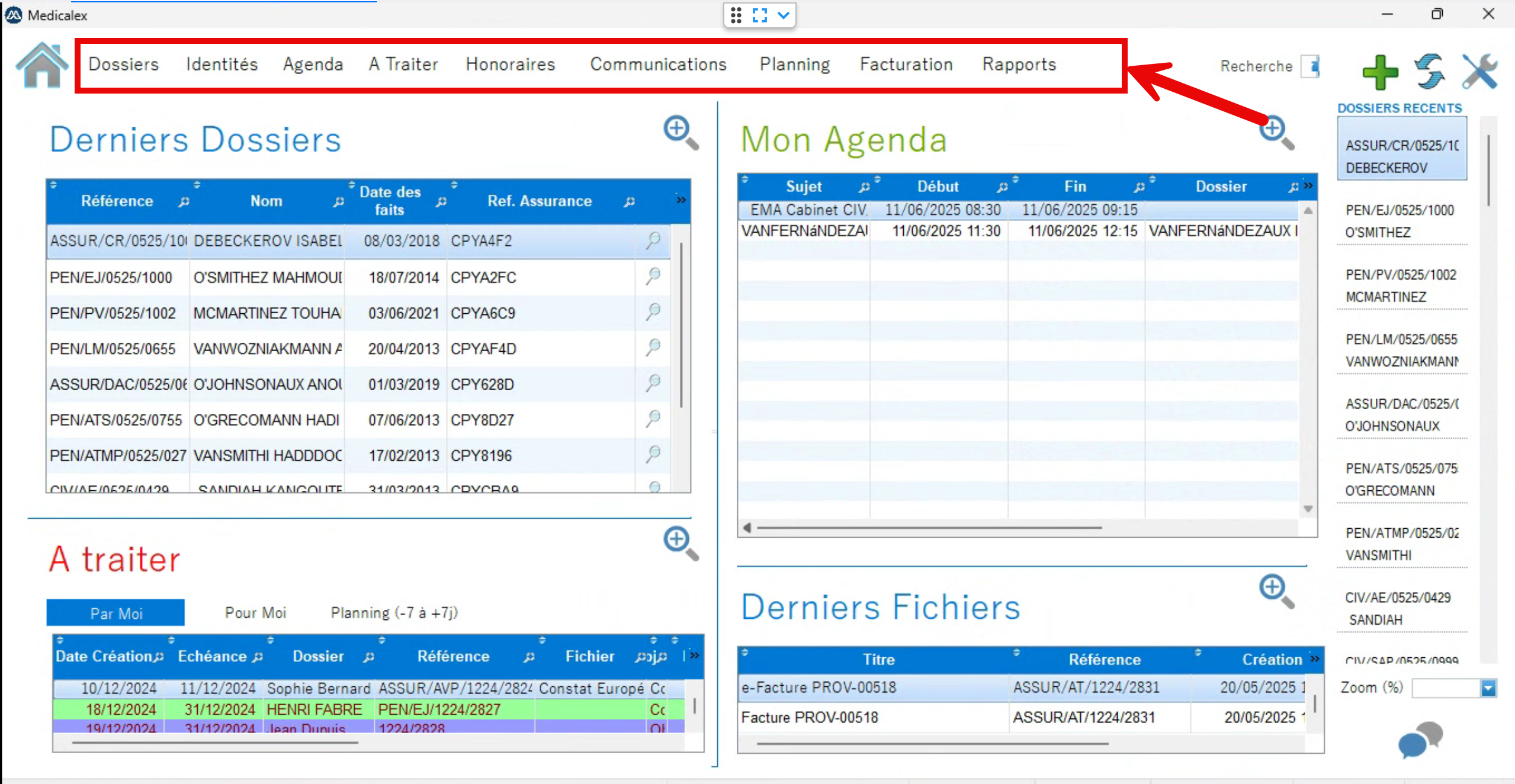 L’interface de Medicalex est également structurée autour d’une barre horizontale d’onglets située en haut de l’écran, accessible depuis n’importe quelle page du logiciel.